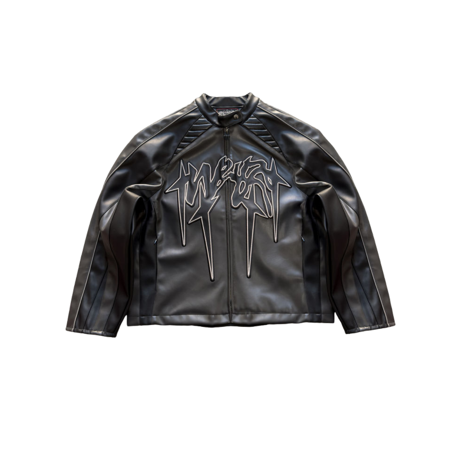 Chaqueta negra con diseños en color café, estilo boxi fit