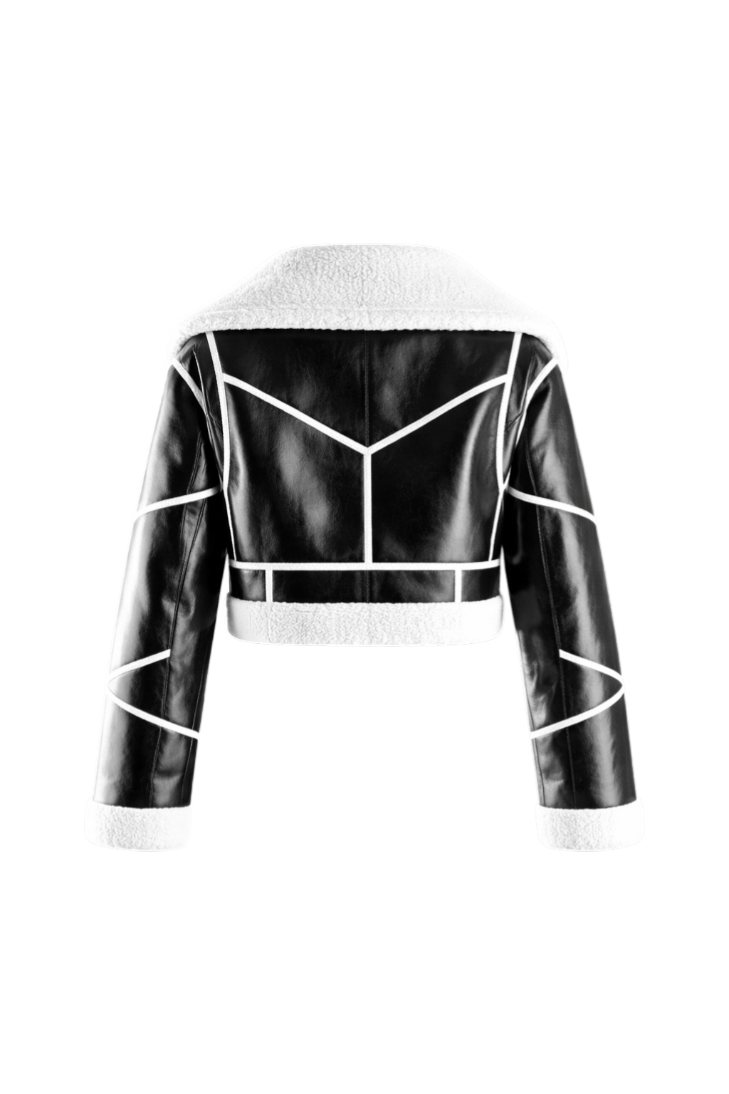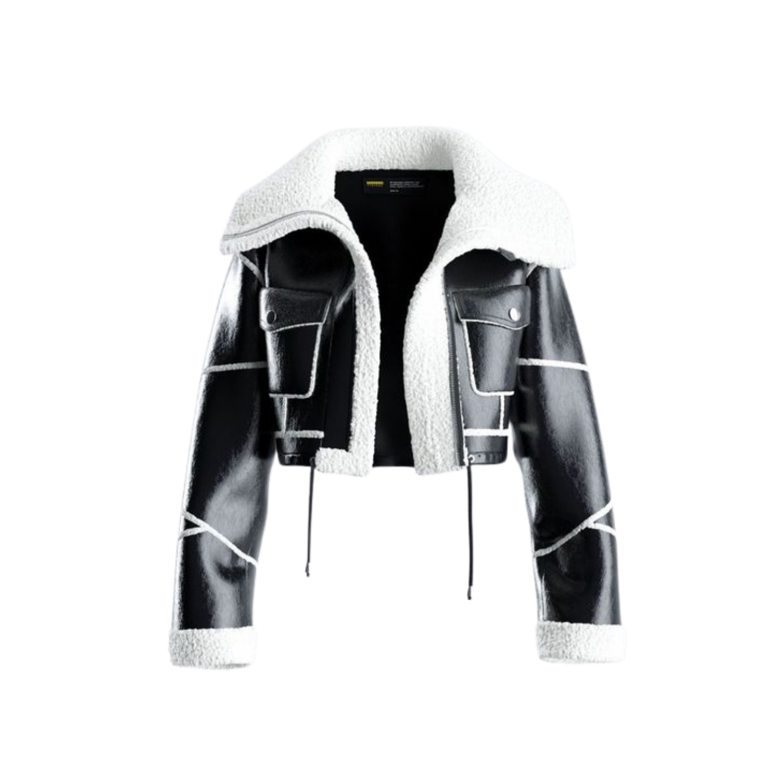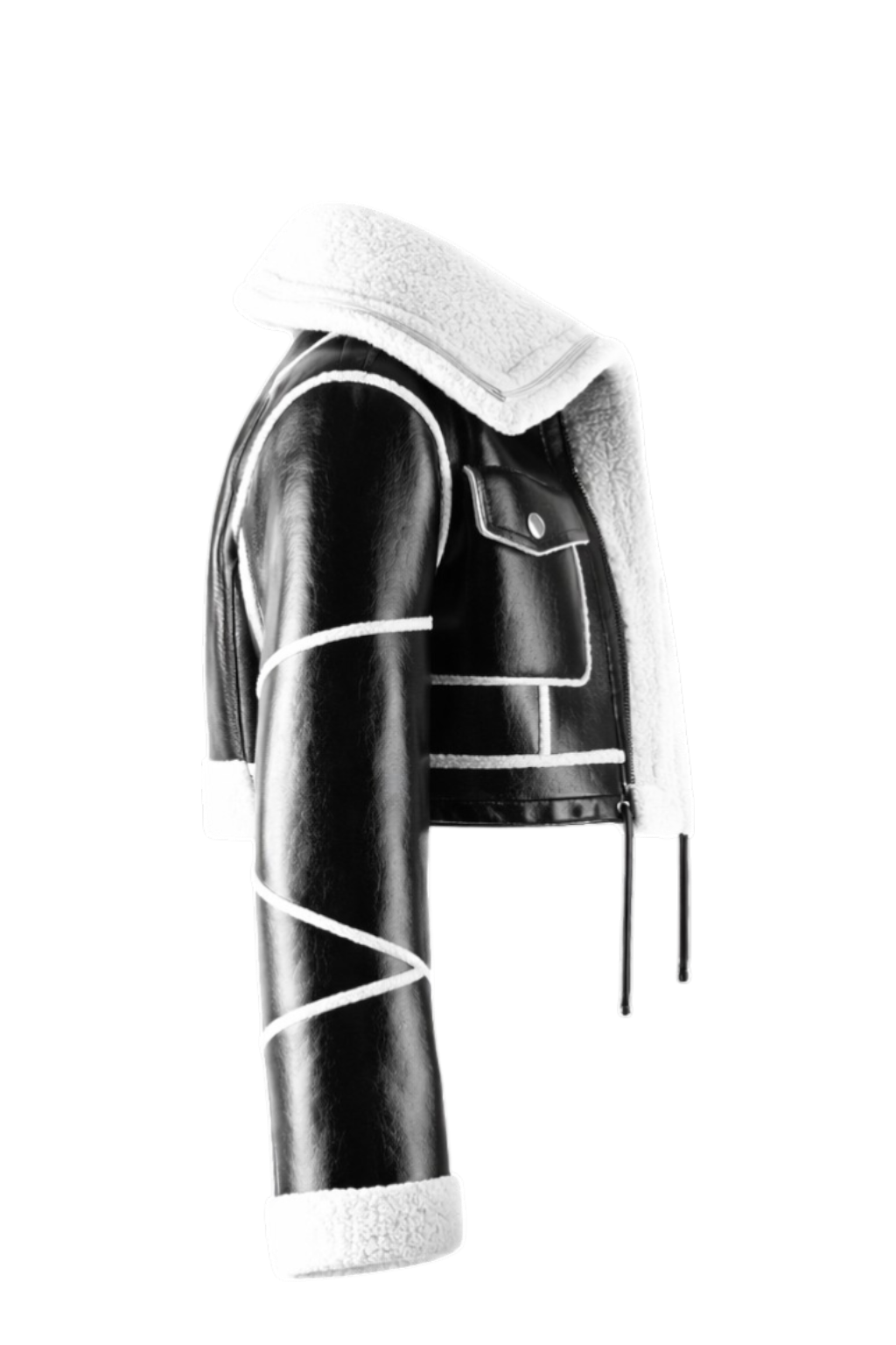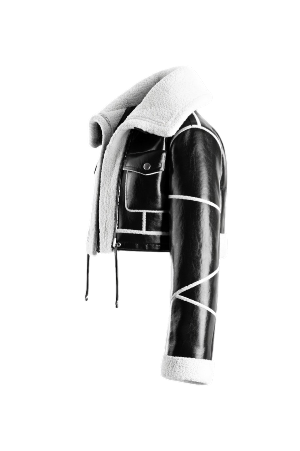 Chaqueta con puff en la parte inferior, de color negra con diseño de cierres y correa