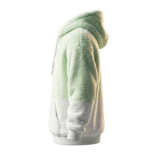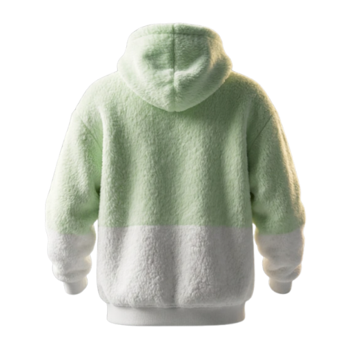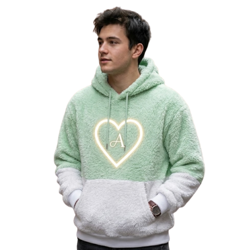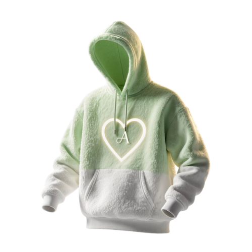 Este hoodie de felpa ultra suave combina un refrescante tono verde menta con blanco puro en un diseño de bloques de color. Su detalle estrella es un corazón de neón con la inicial «A» en el centro, convirtiéndolo en una prenda única que mezcla la calidez del fleece con una estética moderna y luminosa.