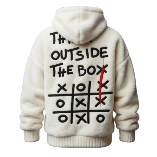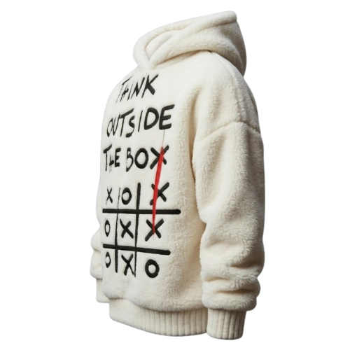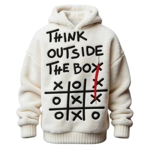 Este hoodie de felpa premium no solo destaca por su suavidad extrema, sino por su potente mensaje visual. Con un diseño bordado de alta calidad que reza «Think Outside The Box» sobre un juego de tres en raya, es la prenda perfecta para quienes buscan un look creativo, audaz y sumamente cómodo para el día a día.