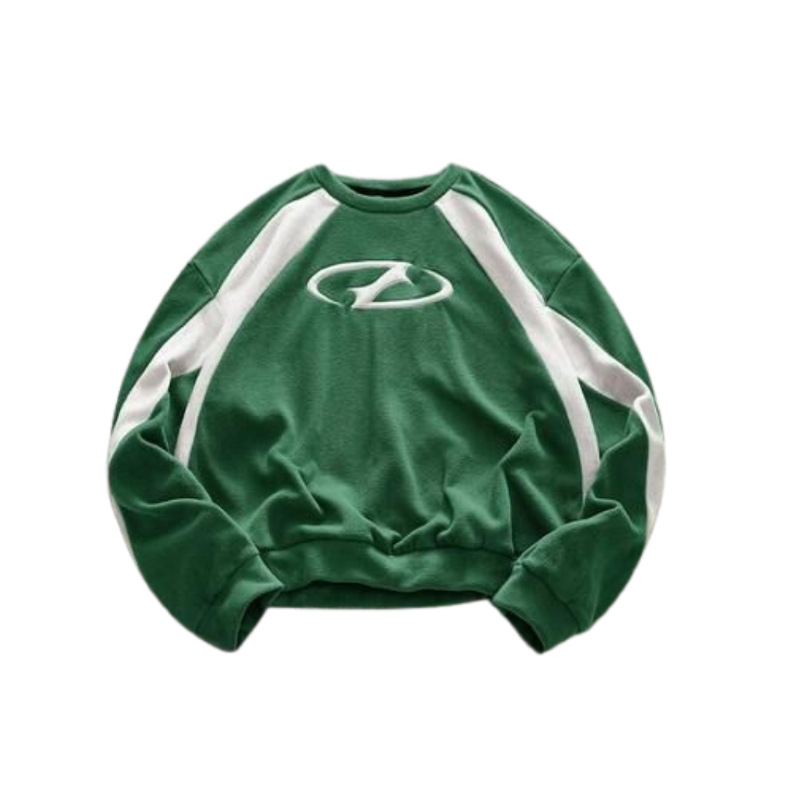 Saco de cuello redondo confeccionado en textil de textura suave y gran caída. Destaca por su vibrante color verde esmeralda y sus mangas raglán con franjas blancas en contraste que estilizan los hombros. Incluye un logotipo ovalado bordado en el centro, hombros caídos y un corte holgado que define un estilo retro deportivo muy actual.