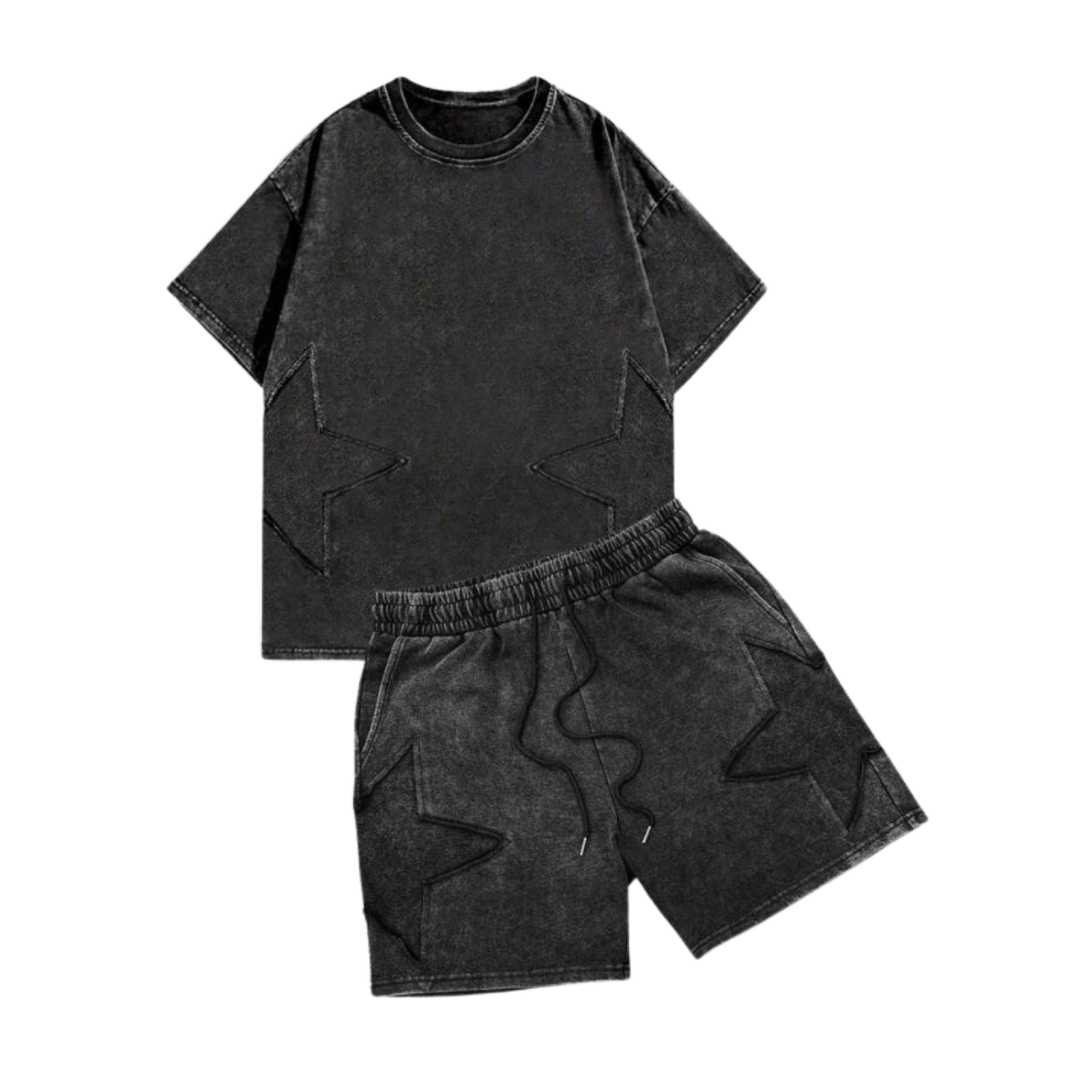 Set de dos piezas con acabado de lavado ácido (acid wash) en tono negro mineral. Destaca por sus detalles de estrellas en relieve y costuras visibles que le dan un aire retro y artesanal. Su corte oversized y textura premium lo convierten en la prenda ideal para un estilo urbano sofisticado y monocromático.