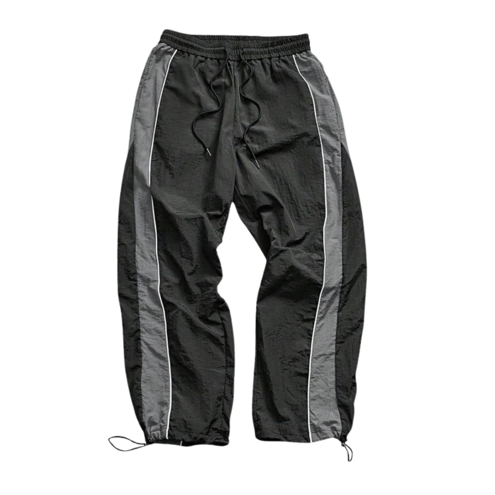Pantalón de estilo deportivo confeccionado en tela técnica de alta resistencia con acabado mate. Presenta un diseño de paneles laterales en contraste gris y líneas reflectantes que estilizan la silueta. Cuenta con cintura elástica con cordones ajustables y tancas en los tobillos para regular el ancho de la bota, permitiendo pasar de un corte recto a uno tipo jogger en segundos.